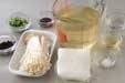 鍋にだし汁を入れて強火にかけ、煮立てば<調味料>を加え、ハンペン、エノキを加える。