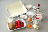 <カスタードクリーム>を電子レンジで作る。耐熱ボウルにグラニュー糖大2、牛乳を入れてよく混ぜ合わせ、ラップをかけずに電子レンジで2分加熱する。