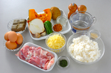 鍋にサラダ油を中火で熱し、ニンニク、ショウガを炒め、香りが立ったら鶏肉を加えて炒め、鶏肉の色が変わったらカボチャ、ジャガイモ、玉ネギを加えて炒め合わせる。