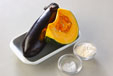 ・抗菌のビニール袋にナスやカボチャと小麦粉を入れて袋に空気を入れ、袋の口を持って振ると簡単に小麦粉をからめることが出来ます。ここではカボチャに小麦粉を薄くからめ、カボチャを揚げている間にナスに薄く小麦粉をからめて下さい。 |