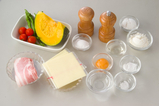 カボチャは2枚1組にして、カボチャの内側に塩コショウを振り掛け、ベーコン、スライスチーズをのせてカボチャで挟み、外れないように楊子を刺して止める。(同様に4~5組作る。)<衣>を混ぜ合わせる。