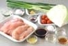 <下味調味料>の白ネギの太い物は縦半分に切り、4cmの長さに切る。ショウガは皮ごときれいに水洗いし、水気を切って薄切りにし、他の調味料と混ぜ合わせる。鶏むね肉は身の厚い部分をフォーク等で刺し、<下味調味料>につけ10分おく。キャベツはせん切りにして水に放ち、パリッとすればザルに上げて水気をきる。