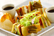 (2)のパンケーキは、それぞれ半分に切る。<パンケーキ・プレーン>はレタス、<卵焼き>、マヨネーズ、ケチャップをはさむ。<パンケーキ・そば>はキュウリ、クリームチーズ、サーモン、粒マスタードをはさむ。食べやすい大きさに切って器に盛り合わせ、ポテトチップスとピクルスを添える。