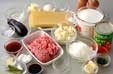 <ミートソース>を作る。ナスはヘタを切り落として、縦半分に切り、5mm幅の半月切りにして塩水に放つ。鍋にサラダ油、ニンニクを入れて中火にかけ、香りが立ってくれば、玉ネギが透き通るまで炒める。合いびき肉を加えてポロポロに炒め合わせ、水気を切ったナスを炒め合わせる。