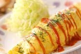 キッチンペーパーをかぶせて上から手で押さえながら形を整えて、キャベツを盛り合わせ、ケチャップをかけ、ドライパセリをふりかける。