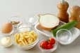 ゆで卵、キュウリを加えて混ぜ合わせ、器に盛り、プチトマトを添える。
