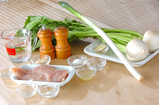 白ネギは縦半分に切って斜め切りにする。ショウガは皮をむき、みじん切りにする。鶏むね肉は食べやすい大きさの削ぎ切りにして、酒をからめて塩を振り掛ける。