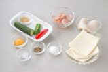 <種>の冷凍ロールイカは小さく切り(半解凍でもOK)、むきエビは背ワタを取り、他の材料とフードプロッセサーorバーミックスor包丁で細かくたたき、少し粒が残る位にこまかくし、1のパンの片面にぬる。