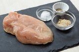 鶏むね肉は厚みのあるところに横から包丁をいれて開き、厚みを均一にする。