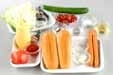 プチトマトはヘタを取り、キュウリは両端を切り落として縦縞に皮をむき、一口大に切る。耐熱容器に入れ、<ピクルス液>をかけ、ラップをして電子レンジで1分30秒加熱する。ラップをはずし冷ましておく。