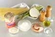 たっぷりの熱湯に塩を加え、スパゲティーをバラして入れ、時々麺どうしがくっつかないように菜ばしで混ぜながら指定時間より30秒短いめにゆで、水切りする。