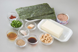 豆腐はキッチンペーパーで包んでおく。ツナ缶は汁気をきる。ピーナッツはザックリと刻む。ニンニクはみじん切りに、ショウガは皮をむきみじん切りにする。焼きのりは両面ガス火で焦がさないようにサッとあぶり、8~12等分に切る。