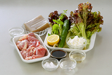 器にサニーレタスを敷いてキュウリを飾り、鶏肉を食べやすい大きさに切ってコンニャクと盛り合わせ、残ったタレを回し掛ける。レモンを散らせカッテージチーズをのせ、あればミントの葉を添える。