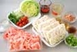 豚薄切り肉は、酒、塩を加えた熱湯に、菜ばしで豚肉を1枚ずつ泳がせ、豚肉の色が変われば冷水に取り、冷たくなればザルに上げて水気を切る。