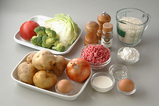 ジャガイモは熱いうちにマッシャー等でつぶし、炒めた合いびき肉と玉ネギ、生クリームを加えて全体に混ぜ合わせる。更に固さを調整しながら卵を加え、ナツメグ、塩コショウを加え、よく混ぜ合わせる。