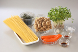 2のフライパンに1のゆでたスパゲティ+シメジとゆで汁大1、しょうゆを加え、全体にからめるように混ぜ合わせて火を止め、貝われ菜を加え、サッと全体に混ぜ合わせる。
