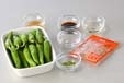 シシトウは水洗いして水気を切り、ヘタを切り落とし、更に斜め半分に切る。
