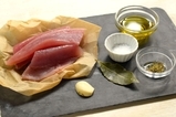 メバチマグロは鍋に入る大きさに切り、表面の水をふき、全体に塩を振る。20分程度置き、再度表面の水分を押さえてふき取る。ニンニクは薄切りに、ローリエは半分にちぎる。
