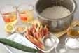 キュウリは薄い輪切りにし、塩少をからめて少し置き、しんなりすれば軽くもみ、水洗いして水気を絞る