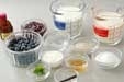 容器にラップをかけて冷蔵庫で1時間位冷やしかためる。器にラズベリージャムをよく混ぜ合わせて流し入れ、ブルーベリーをのせ、ミントの葉を添える。