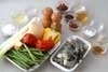 サヤインゲンは水洗いし、水気を拭き取り、軸側を少し切り落とし、長さを2~3等分に切る。赤ピーマンは水洗いし縦半分に切り、ヘタと種を取り除き、サヤインゲンに合わせて切る。白ネギは水洗いして根元を少し切り落とし、縦半分に切って更に斜め薄切りにする。ショウガは皮をむき、せん切りにする。