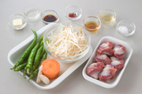 砂肝は白い筋部分を削ぎ落として一口大に切り、身が厚い場合は切り込みを入れる。長唐辛子はサッと水洗いし、水気をきって軸を切り落とし、砂肝位の大きさに切る。ニンニクは縦半分に切って芽を取り、更に縦半分に切る。