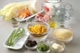 サヤインゲンは軸の部分を少し切り落し、塩少々を入れた熱湯でゆでて水に取り粗熱が取れれば1cm長さに切る。