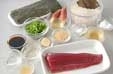ご飯を炊いている間、カツオを<つけダレ>につける。