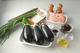 米ナスはヘタを切り落として横に1~1.5cm幅の輪切りにし、塩水につけアクを抜き、水気を拭き取る。