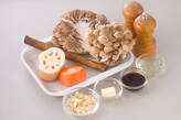 シメジ、マイタケは石づきを切り落とし、小房にわける。レンコンは皮をむいて、縦4等分に切り、3~4mm幅のイチョウ切りにし、水に放つ。ゴボウはタワシできれいに水洗いし、斜め薄切りにして水に放つ。ニンジンは皮をむき、薄いイチョウ切りにする。フライパンにアーモンドスライスを入れ、香ばしく空炒りし、いったん取り出しておく。