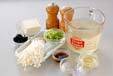 鍋に<スープ>の材料を入れて強火にかけ、煮立てば、豆腐、エノキを加える。