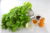 熱湯でカラシ水菜の根元側から入れ、色が鮮やかになったら水に取る。粗熱が取れたら水気を絞って、根元を切り落とし3cmの長さに切る。