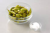 枝豆は枝からサヤを切り取り、ハサミで両端を切り落とし、よく水で洗う。水気を切ってボウルに入れ、塩大2でよくもむ。