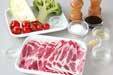 フライパンにサラダ油を中火で熱し、豚肉を両面薄く焼き色がつくまで焼く。