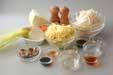 中華鍋にサラダ油大3を加え強火にかけ、白ネギ、ニンジン、玉ネギを炒め、少ししんなりすれば、シイタケ、モヤシ、ニラ、キャベツを炒め合わせる。