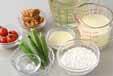 <スープ>を作る。鍋にだし汁を入れて強火にかけ、煮立てば火を止め、みそを溶き入れる。豆乳を加え、鍋底を氷水にあて粗熱が取れれば、冷蔵庫で冷やす。