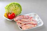 器にレタスと鶏肉を盛り付け、レモン、トマトを添える。
