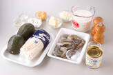 アボカドと1、3を加え混ぜ合わせ、耐熱容器に入れ、塩、コショウ、粉チーズを振りかけ、250℃のオーブンに入れ、美味しそうな焼き色がつくまで6~7分焼く。