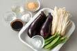 ナスはヘタを切り落として縦半分に切る。5mm幅の半月切りにし、水に放つ。