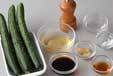 <合わせダレ>を混ぜ合わせ、キュウリをつけ込み20分置いて、味を整える。