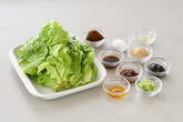 サンチュに<みそディップ>を塗り、ご飯や炒めた肉や野菜、生野菜を巻いて食べる。