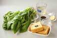 ホウレン草は水洗いし熱湯でサッとゆで、水に放ち粗熱が取れれば水気を絞って、根元を切り落とし4cmの長さに切る。