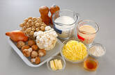 耐熱容器に3を入れ、ピザ用チーズを散らし、250℃のオーブンで焼き色がつくまで焼く。