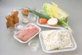 フライパンに油を入れ、強火で鶏肉を炒め、色が変わってくれば玉ネギを加え、しんなりすればキャベツ、ニンジンを炒めあわせる。