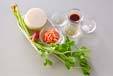 <合わせダレ>を混ぜ合わせ、桜エビ、ミョウガも合わせる。