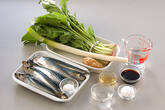 イワシは尾側から頭に向かって指先でなでるようにウロコを取り、頭と尾を落とし、腹を斜めに切ってワタを出す。塩水できれいに洗い、水気を切り、3等分の長さに切る。
