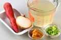 鍋にだし汁、水をきったサツマイモを入れて中火にかけ、煮立てば火を弱め、サツマイモが黄色くなってくれば玉ネギを加える。