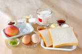 <卵液>の卵は食パンが入る大きさの容器に割り入れて溶き、他の材料と混ぜ合わせる。食パンを入れて浸し、スプーンで押さえながら<卵液>を吸わせる。
