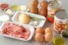 <ソース>を作る。鍋にオリーブ油、玉ネギ、ニンニクを加えて強火にかけ、玉ネギがしんなりすれば、豚肉を加えて更に炒めあわせる。