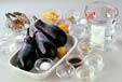 鍋に<スープ>の材料を入れ強火にかけ煮立てば、水気を拭き取ったナスを入れ、くったりするまで煮ていったん火を止めて、ナスを取り出す。